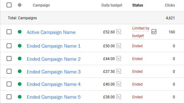 Now, a lot of what I’m about to say could be user error and I’m just not being patient enough to find what I’m looking for. But this is exactly my point. I’m busy optimising lots of campaigns and lots of accounts on a daily basis, being slowed down to now try and figure out where Google have hidden where to only show enabled campaigns is not a fun game. As soon as I load up my account, I’m displayed with all the campaigns that are enabled AND ended. Previously, AdWords would just show me all enabled campaigns, and I had the option for it to show me paused as well. Now, Google doesn’t differentiate between enabled and ended: