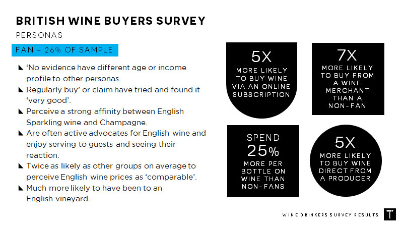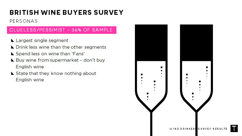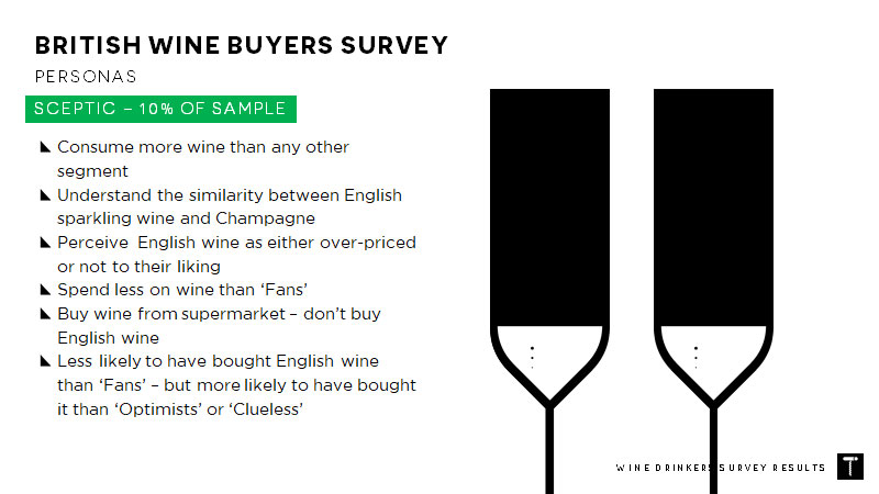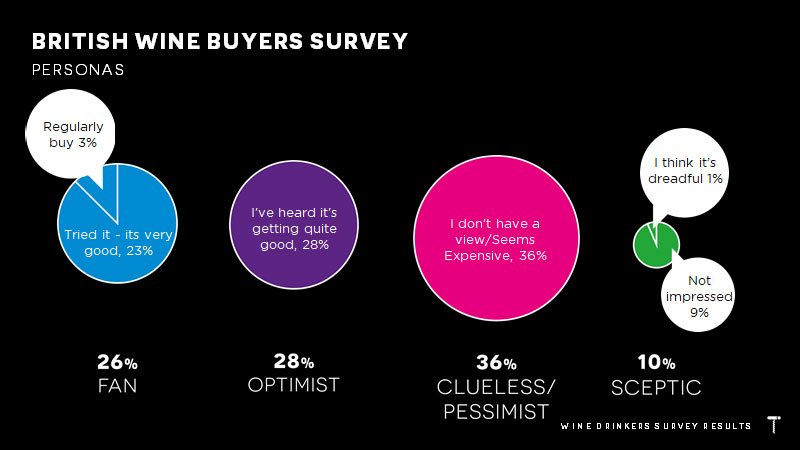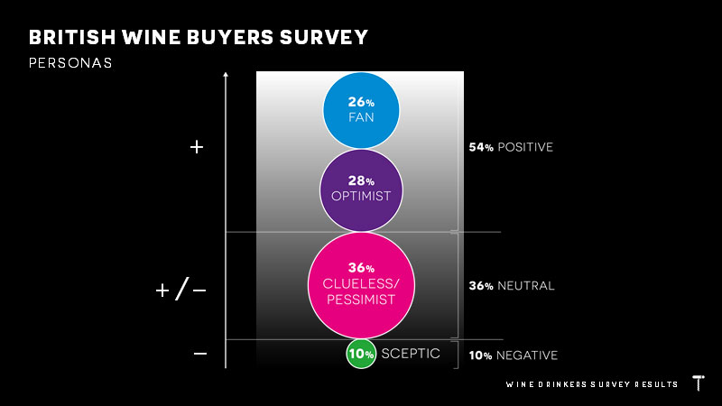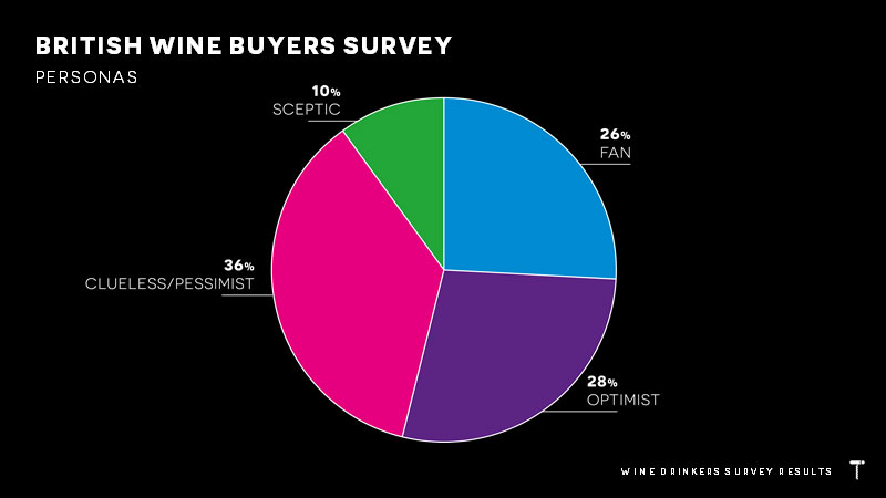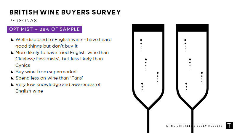 The research looked at all aspect of our respondent’s approach to selecting and buying wine. However, as our special interest was English wine, we used the respondents’ knowledge and attitudes to English wine to identify 4 Personas: We called these: ‘Fans’, ‘Optimists’, ‘Clueless/Pessimists’ and ‘Sceptics’.