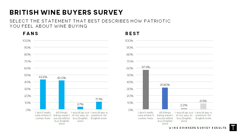 So we did ask. And what did we find? That for fans – all things being equal (price, quality etc.) – they would rather buy English wine. Even 32% of non-Fans thought the same thing. In fact 11% of fans and 8.5% of non-Fans said that they would even pay a premium for it.