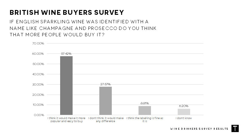 Lastly, we asked respondents their opinion on the big controversy: ‘If English sparkling wine was identified with a name like Champagne or Prosecco do you think that more people would buy it’?