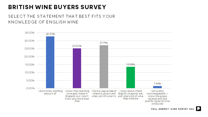 In terms of knowledge, it seems that the majority don’t have much understanding of English wine with 85% having ‘not a clue’ or ‘only the vaguest idea’.