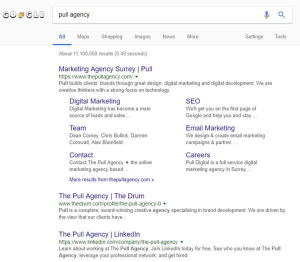 Think about the subliminal effect of this situation on someone looking for you with a brand term. Chances are that at this point they won’t even click your link. Meaningful brands own their search results.