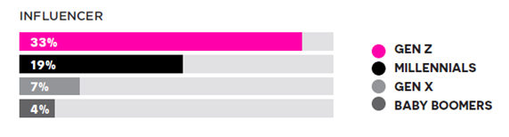 - but, this is highest of all generations with 11% of millennials selecting celebrities, falling to only 4% for Baby Boomers. But this is well below the influence that social media influencers and friends have.