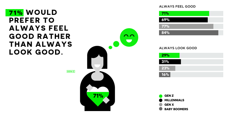 Often viewed as superficial – the “Instagram generation” and “anti-social” for living life behind a screen - our research showed that seven out of ten would actually prefer to always feel good than always look good (by contrast, Millennials are the ones who most want to look good rather than feel good). You can see from the chart below that Gen Z actually bucked the trend – which was clear across the other generations – to be more inclined to feeling good than looking good as they got older.