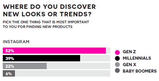 Apparently tired of celebrities, Gen Z are nevertheless discovering new looks or trends online. Often seen as the ‘Instagram Generation’ our research confirmed that perspective with 52% citing Instagram as their key source and 25% citing YouTube.