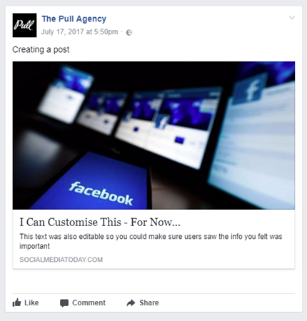 In fact, anyone who manages a Facebook business page will start to see their ability to share content hampered, beginning this month. Previously, when copying a link from another site and sharing it within Facebook, users had the ability to customize certain parts of what Facebook would display in people’s feeds – namely the image, headline and description, AKA the metadata. As of July, this will cease to be possible.