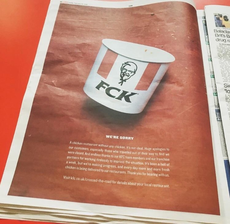 The highest profile example that we’ve seen this year is KFC’s attention-grabbing apology print ad ‘FCK’ that went viral on social media despite being run as a printed advert (a savvy move that gave the campaign more gravitas with newspapers coming up top in trusted sources), and which picked up numerous awards at Cannes last week.