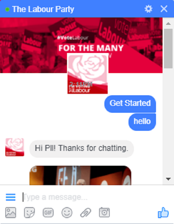 When I check out Labour’s Facebook page, a messenger tab automatically opens encouraging me to interact with the Labour chatbot, which gives info on where to vote, how to help out, the policy forum, and who to email if I have questions. The Tories’ Facebook page has no such feature.