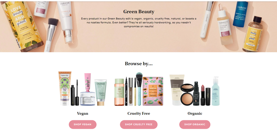 In on trend are beauty subscription boxes like Birchbox, who offer a specific section on their site dedicated to green beauty, boasting products which are organic and cruelty free. And Beauty Pie a luxury beauty product buyers’ club who offer significant discounts after becoming a member.