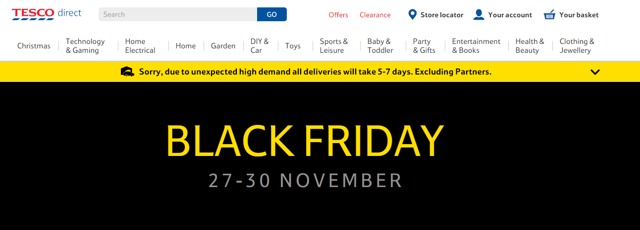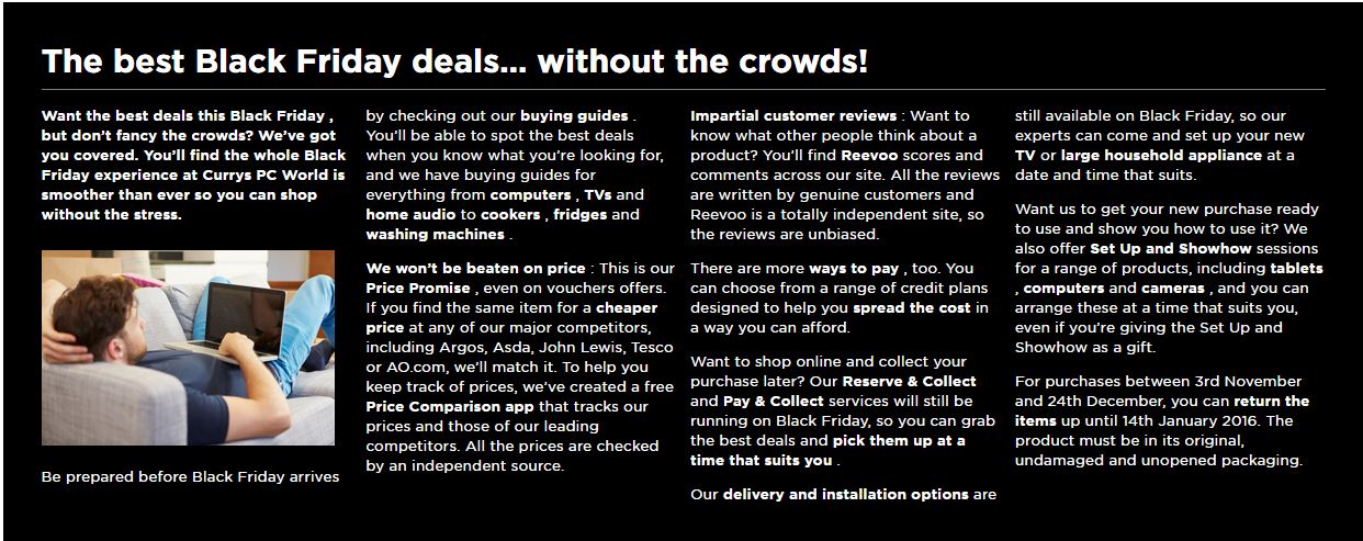 Electricals retailer Currys is encouraging people to shop online this Black Friday. Below is a snippet of their Black Friday landing page. Customers can register their interest by email, buy online on the day and pick up from store, thus avoiding disappointment and avoiding shopper disputes in their stores.