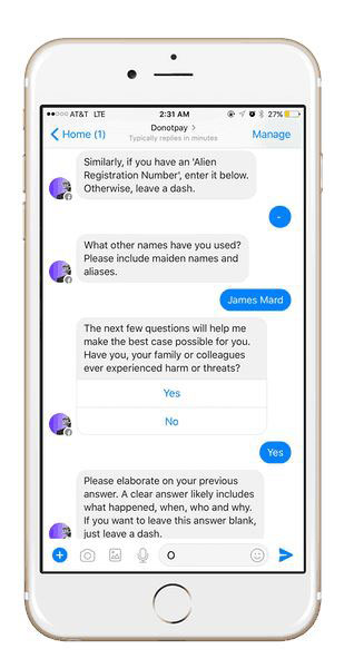 Browder, the creator, worked with lawyers in the US and Canada to put together a wide range of scenarios and answers based on the asylum seekers needs. The chat bot works by asking a series of questions. Once it has established what kind of situation it’s dealing with, the chat bot can then determine which asylum form is needed and whether the person is eligible for asylum protection.