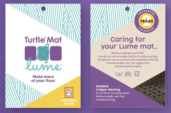 The challenge was to find a way to merge the two logos and visual identity to create a sub-brand design for the new nylon Turtle Mat Lume doormats, whilst keeping the brand fresh and maintaining the integrity of the Turtle Mat logo as a well-recognised, reliable brand.