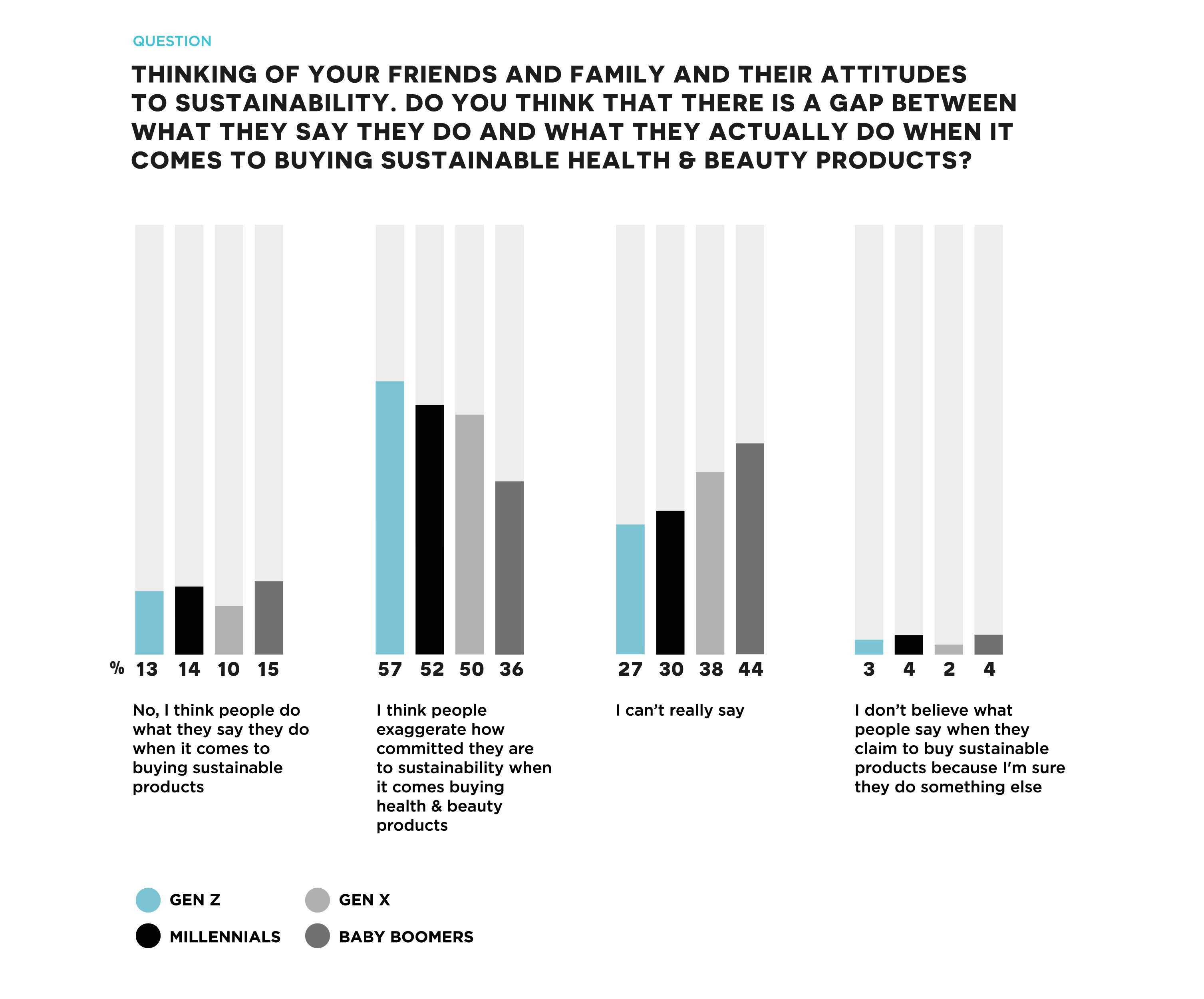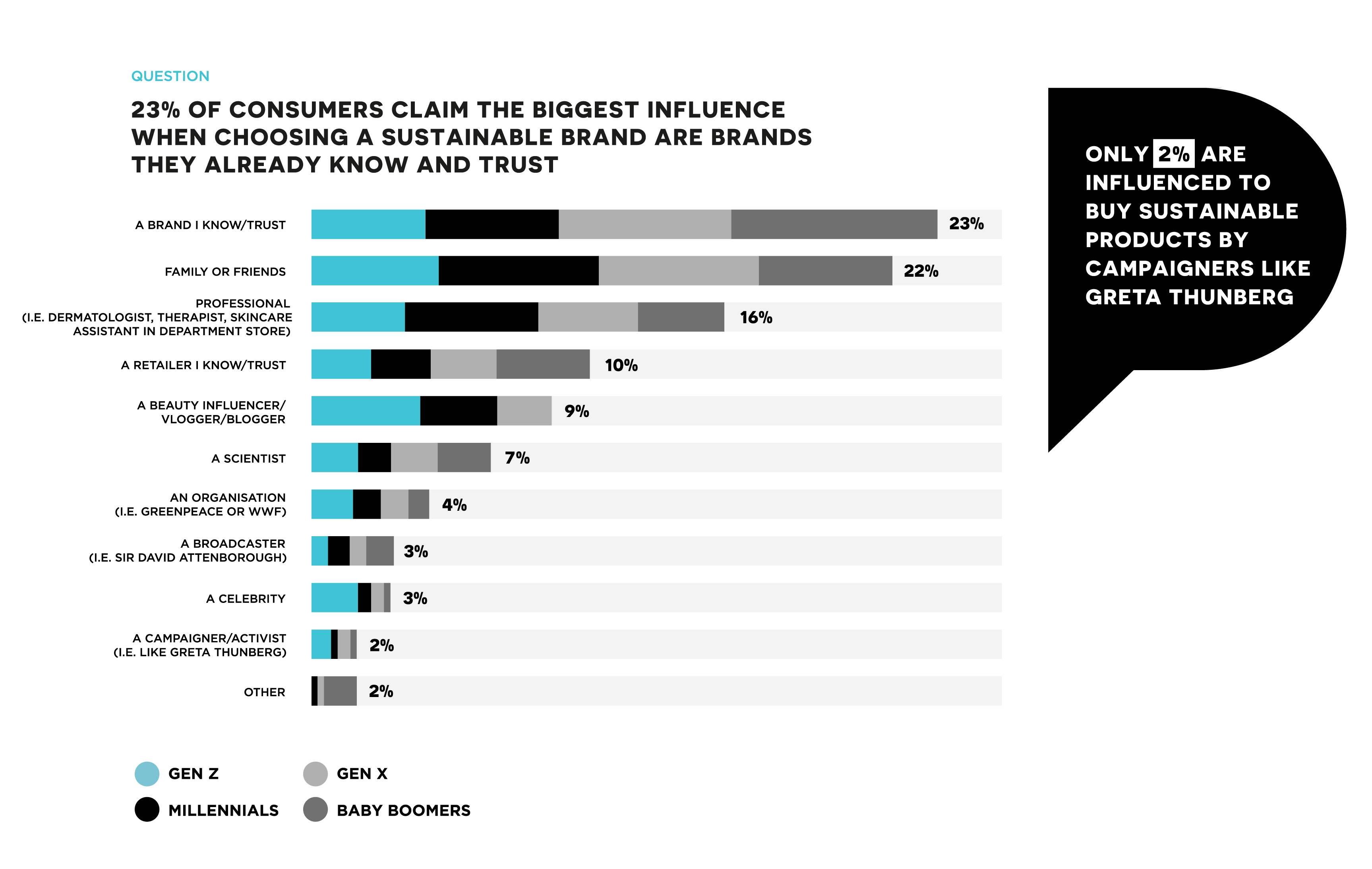 This was the biggest surprise from our research. Health & Beauty consumers are most influenced by brands (this is most true of the older generations, both Gen Z and Millennials are slightly more likely to be influenced by friends and family) and least by activists like Greta Thunberg and even broadcasters like Sir David Attenborough or organisations like Greenpeace. However, it didn’t seem much of a surprise to our panellists.