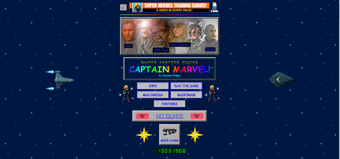 The first and most obvious digital interpretation that has dared to embrace 90’s design is the Captain Marvel’s website. According to the Captain Marvel Counter seen on the website it has already had over 13million visitors, so clearly is a huge success. Clip art backgrounds, gifs, 3D text, a rainbow of colours and bold fonts can all be found here. Clearly a lot of effort has been put into making it a believable replica of websites that populated the internet in the 90s, captivating users of all ages. As well as sparking memories for people who lived through that time, it’s also an interesting introduction for people who have not yet experienced it, giving a greater sense of belonging, meaning and security. Particular eras are often associated with strong emotions and positive themes, making the design more welcoming.